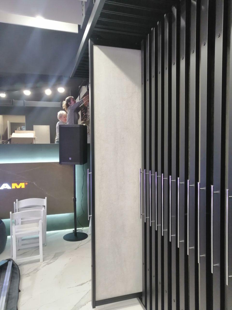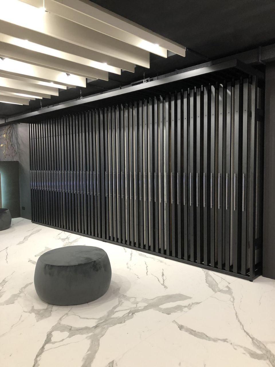 Экспозитор купе вертикальный. Данный стенд состоит из двух равных стендов, общее количество планшетов 50 шт, на которые можно разместить до 100 образцов. В данном экспозиторе имееются доводчики, которые позволяют задвигать планшеты автоматически, удобен для широкоформатной плитки.